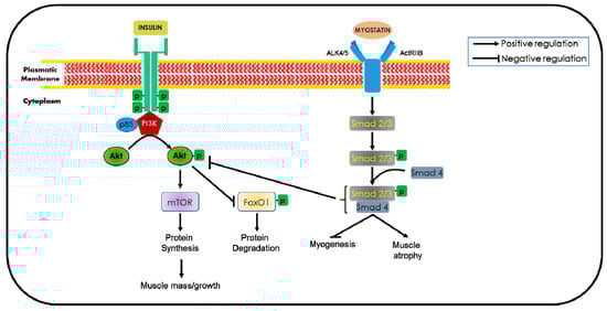 Myostatin (MSTN) was first discovered during screening for novel members of the transforming growth factor-β (TGF-β superfamily). MSTN is a potent negative regulator of muscle growth []. Beneficial effects on metabolism, adiposity, and insulin sensitivity have been found with low levels of MSTN. There was elevated muscle glucose utilization and insulin sensitivity linked to increased lean mass and diminished fat mass in MSTN-null mice and in mice treated with a soluble receptor to MSTN, namely activin receptor type IIB (ActRIIB). MSTN leads to receptor mediated phosphorylation of Smads 2 and 3, and binds to Smad 4. Increased Smad2/3/4 signaling inhibits the Akt/mTORC1 pathway, thus leading to protein degradation and muscle atrophy (Figure 1) [,,].