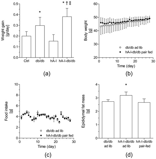 The total caloric intake and body weight were higher in db/db mice maintained on a regular chow diet (~1.3-fold and ~1.6-fold, p < 0.05, respectively) than in nonobese control mice (Table 1). A significantly greater weight gain was observed in hApoA-I transgenic (hA-I)-db/db mice (hA-I-db/db mice: 0.38 g/day; daily increase: ~1.3-fold, p < 0.05) than in age-matched db/db mice (db/db mice: 0.30 g/day) (Table 1 and Figure 1a), and this finding was mainly attributed to an increased food intake (Table 1). Consistent with these findings, the epididymal fat pad was also larger (~1.3-fold, p < 0.05) in hA-I-db/db mice than in db/db mice. Plasma glucose levels in hA-I-db/db mice were similar to db/db mice (Table 1 and Figure S1, Supplementary Materials). The overexpression of hApoA-I in db/db mice did not improve the impaired glucose tolerance in db/db mice (Figure S1, Supplementary Materials). We performed pair-feeding experiments in which both db/db and hA-I-db/db mice were fed the same amount of food based on the daily food consumption of a separate group of db/db mice (Figure 1b,c). Under these conditions, hA-I-db/db mice no longer gained weight more rapidly than db/db mice. Similarly, the increased epididymal fat mass of hA-I-db/db mice was also neutralized by pair feeding (Figure 1d).