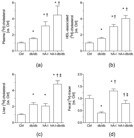 Compared with nonobese control mice, the db/db mice showed a reduced fecal output of the [3H]-tracer (both in the form of cholesterol and bile acids) (~0.5-fold, p < 0.05) (Figure 3; Table 4). This finding confirmed previous data from our laboratory [24] indicating that the hepatobiliary trafficking of cholesterol into feces is impaired in db/db mice. As expected [21], overexpression of hApoA-I in the nonobese control hA-I mice increased the fecal levels of the [3H]-tracer (either in the form of cholesterol or biliary acids) (cholesterol: ~1.7-fold, p < 0.05; bile acid: ~1.5-fold, p < 0.05) (Figure 3; Table 4). Similarly, higher fecal release of the [3H]-tracer was also observed in hA-I-db/db mice than in db/db mice (~2.0-fold, p < 0.05) (Figure 3; Table 4).