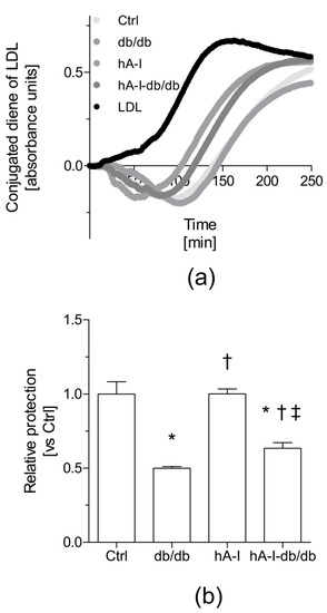 Overexpression of hApoA-I protects low-density lipoprotein (LDL) from ex vivo oxidation in db/db mice. The extent of copper-induced lipid oxidation was evaluated by measuring the formation of conjugated dienes in HDL + LDL mixtures. The results are reported as the lag phase of conjugated diene formation kinetics, which are presented as the relative lag phase to the kinetics of LDL oxidized without HDL (oxLDL). (a) Representative diene formation curves of human LDL co-incubated with HDL isolated from the different mouse groups in the presence of 2.5 μM Cu2SO4 at 37 °C. The kinetics of LDL oxidation are shown after subtracting the kinetics of HDL activity in the absence of LDL. (b) HDL antioxidant activity toward the LDL oxidative modification. For calculations, the mean lag time of oxLDL (52 min) was set to a normalized value of 1 arbitrary unit. The results are presented as the means ± standard errors of three independent pools of HDL obtained from 3–4 individual mice per group. Differences between mean values were assessed using the nonparametric Kruskal–Wallis test followed by Dunn’s post-test or an ANOVA followed by the Newman–Keuls post-test, as appropriate; differences were considered significant at p < 0.05. Specifically, * p < 0.05 compared with the Ctrl group, † p < 0.05 compared with db/db mice, and ‡ p < 0.05 compared with hA-I mice. Abbreviations used: Ctrl, control mice; db/db, db/db mice; hA-I, hApoA-I-transgenic mice; hA-I-db/db, hApoA-I-overexpressing db/db mice.