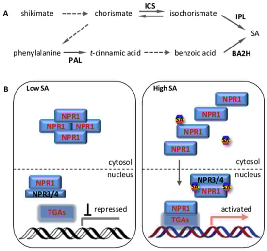 SA is a phenolic compound that has been shown to regulate various aspects of plant growth and development. SA is also a critical signaling molecule for activating defense responses against pathogen infection. The first indication of the involvement of SA in pathogen responses was provided by White et al. []. They showed that the injection of SA into tobacco leaves led to pathogenesis-related (PR) protein production and increased resistance to tobacco mosaic virus (TMV). Since then, SA has been shown to induce PR gene expression and enhance resistance in a broad spectrum of plant species []. Conclusive evidence supporting SA as a critical signal in the defense response was produced from studies using Arabidopsis. Plants with reduced SA amounts due to the ectopic expression of the bacterial nahG gene (a SA-degrading salicylate hydroxylase) or dysfunction of the SA biosynthesis SID2/ICS1 gene (salicylic acid induction deficient 2/isochorismate synthase 1) exhibited reduced local and systemic resistance and were more susceptible to biotrophic pathogen infection, whereas the exogenous application of SA restored the resistance [,].