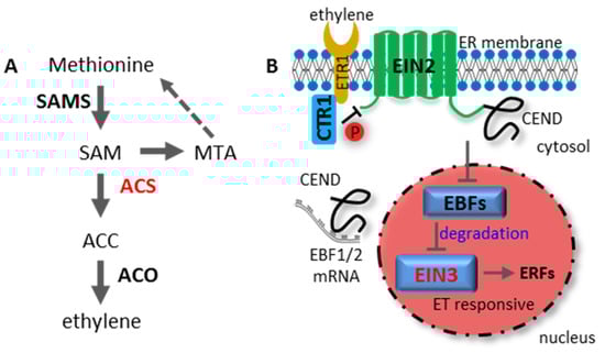 ET is a gaseous hormone that has been recognized as a plant growth regulator for more than a century. The ET biosynthetic pathway, also known as the Yang cycle, begins with the amino acid methionine [] (Figure 2A). 1-aminocyclopropane-1-carboxylic acid (ACC) synthase (ACS) is a rate-limiting enzyme of ET biosynthesis, which converts S-adenosyl methionine (SAM) to ACC []. As a diffusible, gaseous and non-degradable hormone, ET biosynthesis has to be tightly controlled. Therefore, the regulation of ACS activity confers strict control of ET production.