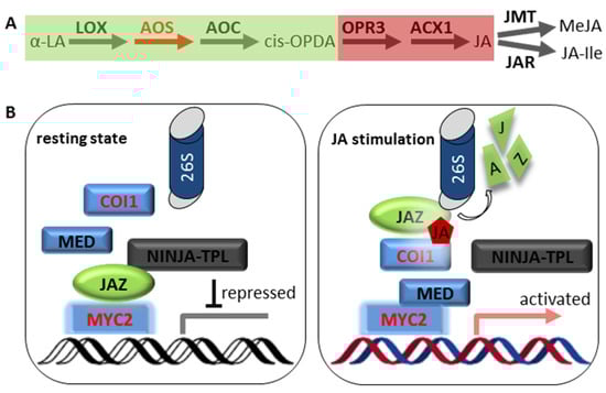 Jasmonate (JA) biosynthesis and signaling transduction pathway. (A) Model for the JA biosynthesis pathway. The intermediate OPDA is synthesized in the chloroplasts. JA is synthesized in the peroxisomes and exported to the cytosol, where it is converted to other bioactive derivates (i.e., JA-Ile). The key enzyme AOS is highlighted in red. (B) Model for the JA signaling transduction pathway of the MYC-branch in Arabidopsis. In the non-induced cells (left, low JA level), MYC2 activity is repressed by JAZ proteins that interact with NINJA to recruit transcriptional repressor TPL. In the JA-stimulated cell (right, high JA level), JAZ proteins are degraded by the SCFCOI1-mediated 26S-proteosome. MYC2 is released to interact with the transcriptional mediator to activate JA-responsive gene expression. Abbreviations: α-LA, α-linolenic acid; ACX1, acyl-CoA-oxidase 1; AOC, allene oxide cyclase; AOS, allene oxide synthase; COI1, coronatine insensitive 1; JA, jasmonic acid; JA-Ile, Jasmonic acid-isoleucine conjugate; JAR, jasmonate resistant; JAZ, jasmonate ZIM domain; JMT, JA methyl transferase; LOX, 13-lipoxygenase; MeJA, methyl jasmonate; MED, mediator; NINJA, novel interactor of JAZ; OPDA, 12-oxophytodienoic; OPR3, OPDA Reductase 3; TPL, TOPLESS.