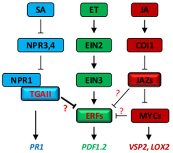A simplified schematic representation of the signaling network between defense hormones, highlighting the crosstalk at the transcriptional level. Arrows indicate positive effects (activation), blunt-ended lines indicate negative effects (repression), questions indicate unknown mechanisms underlying the repression of ERFs by TGAs, JAZs and MYCs.