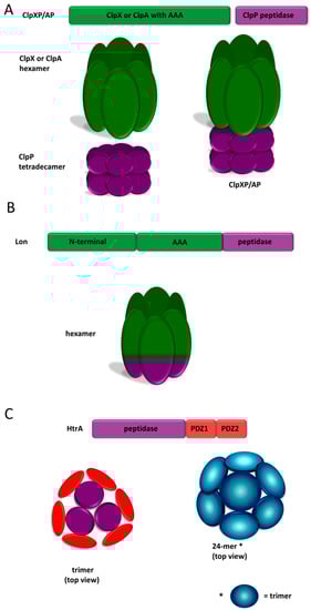 Structures of proteases ClpAP/ClpXP (A), Lon (B), and HtrA (C). Schematic domain structures and exemplary quaternary structures of proteases are presented. The peptidase domain/subunit is shown in purple, the unfoldase domain is green, and the PDZ (post synaptic density protein 95, Drosophila disc large tumor suppressor, and Zonula occludens-1 protein) domain is red.