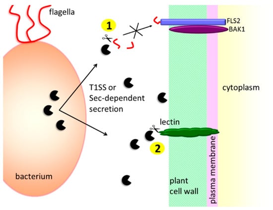 One of the first events associated with bacterial infection and plant cell immune response is the recognition of PAMPs by the plant cell membrane PRRs to subsequently induce a PTI response. Therefore, bacteria have developed several tactics to avoid being recognized by the host. For example, P. syringae pv. tomato secretes the AprA protease into the plant apoplast. AprA degrades monomers of flagellin, strong inducers of innate immune responses [,]. In the process of assembly of bacterial flagellum, a certain fraction of the flagellin monomers “leaks” into the medium; eventually, flagellin monomer arises from the damaged flagellar filaments []. AprA is specific for the flagellin monomers, and it does not cleave the polymeric flagellin. Hence, it prevents flagellin-mediated immune responses without impairing the bacterial motility [] (Figure 2).