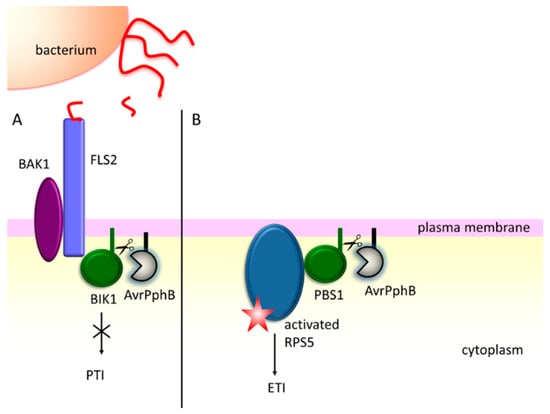 The AvrPphB effector protease from P. syringae acts as a double sword in the plant response to bacterial infection. (A) After the recognition of flagellin by FLS2, AvrPphB degrades the botrytis-induced kinase 1 (BIK1) of the active receptor complex and blocks the pattern-triggered immunity (PTI) pathway [,]. (B) Alternatively, AvrPphB may cut the PBS1 protein, which is guarded by the RPS5 (resistance to Pseudomonas syringae 5) protein. RPS5 becomes activated and induces the effector-triggered immunity (ETI) response [].