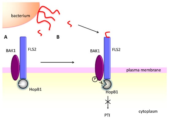 The HopB1 effector protease from P. syringae suppresses the PTI plant response []. (A) HopB1 constitutively interacts with the unstimulated FLS2 receptor. (B) When the activated receptor complex is formed, HopB1 degrades phosphorylated BAK1 and blocks the PTI response.