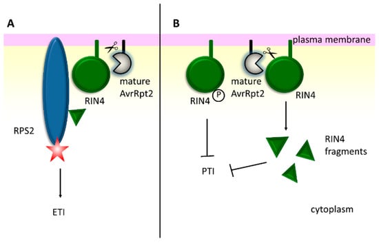 AvrRpt2 is a cysteine protease of P. syringae pv. tomato that undergoes activation and autoprocessing within plant cells [,,]. The activation of AvrRpt2 requires conformational changes induced by the host cell general folding catalyst, cyclophilin (e.g., Arabidopsis ROC1). Cyclophilin binds AvrRpt2 and properly folds it by peptidyl-prolyl cis/trans isomerization. The activated AvrRpt2 then cuts its N-terminal 71 amino acids away, and the truncated form localizes to the plasma membrane, where its substrates reside [,]. AvrRpt2 induces the HR response in Arabidopsis by targeting RIN4 (RPM1(resistance to Pseudomonas syringae pv. maculicola1)-interacting protein 4), a plasma membrane associated protein [,]. RIN4 is a target for multiple effectors, however, its role in plant immunity is not fully understood. Presumably, it is implicated in the regulation of stomatal opening []. RIN4 is guarded by two R proteins, RPM1 and RPS2. The first one senses the phosphorylation of RIN4 as a result of effector proteins AvrB and Rpm1, and the other perceives the cleavage of RIN4 by AvrRpt2. Hence, the proteolytic activity of AvrRpt2 produces signals to induce ETI in a resistant plant [] (Figure 5A). However, in the absence of RPS2, the cleavage of RIN4 suppresses the host’s ability to respond to the presence of AvrB or AvrRpm1. Interestingly, RIN4 exhibits an anti-PTI activity, and the phosphorylated form of RIN4 acts stronger than the non-phosphorylated one []; moreover, RIN4 fragments suppress PTI more efficiently than membrane-anchored RIN4 []. Hence, targeting RIN4 provides one of the strategies to inhibit pathogen recognition (Figure 5B). The RIN4 protein belongs to the plant-specific nitrate-induced (NOI) family []. It was demonstrated that AvrRpt2 was able to cleave almost all of the NOI family members (14 out of 15). The consensus amino acid sequence for cleavage was determined as follows: [LVI]PxFGxW (where x stands for any amino acid) [].