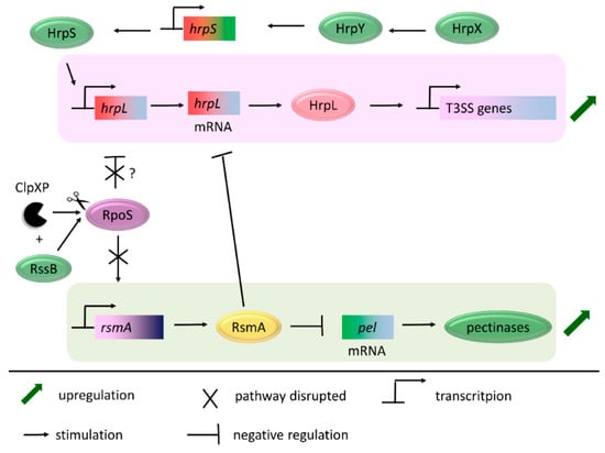 In D. dadantii and E. amylovora, the RpoS protein level was shown to be directly limited by the ClpXP proteolytic complex with assistance of RssB. The clpXP mutants of both bacterial species accumulate RpoS, and the increased content of RpoS has a direct impact on the expression of several virulence factors. First of all, the T3SS gene expression is downregulated. The aspect of ClpXP-dependent regulation of the T3SS pathway was studied in detail in D. dadantii 3937 []. As shown in Figure 6, the genes coding for T3SS are under the direct transcriptional control of the HrpL protein, a member of the extracytoplasmic function (ECF) family of alternative sigma factors. The transcription of the hrpL gene is regulated by the HrpX/HrpY–HrpS regulatory pathway, while the stability of the hrpL mRNA is controlled by the RsmA/rsmB sRNA. The functioning of both regulatory systems is RpoS dependent, and, as a consequence, also ClpXP dependent. RpoS was found to negatively regulate the hrpL promoter activity (by an unknown mechanism) and also to destabilize hrpL mRNA by stimulation of the rsmA expression. RsmA (CsrA) (a small RNA-binding protein) is a global regulator of the posttranscriptional gene expression in diverse bacterial species, and its activity is modulated by non-coding regulatory RNA molecules, termed small RNAs (sRNAs) (e.g., rsmB RNA (CsrB)). RsmA can bind and destabilize the target mRNA, including hrpL mRNA [].