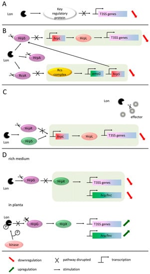 The Lon protease acts as a negative regulator of the Type III secretion system. (A) Lon functions through the degradation of the key regulatory proteins—a general scheme [,,]. (B) In E. amylovora, Lon negatively regulates T3SS at multiple levels. First of all, it degrades HrpS, a positive regulator of the hrpL gene expression []. Moreover, Lon cuts the RcsA component of the RcsA/RcsB complex, involved in activation of the hrpS gene transcription. Lon also targets directly components of T3SS (e.g., it degrades HrpA, a structural protein of the pilus) []. (C) P. syringae Lon downregulates the T3SS expression by the proteolysis of HrpR, a component of the enhancer complex HrpR–HrpS that stimulates transcription from the hrpL promoter []. Additionally, Lon degrades the effector molecules prior to their export []. (D) In X. citri subsp. Citri, phosphorylation on Lon is responsible for the differential expression of T3SS in the external and host environments []. Under non-host conditions, Lon is an active protease and it degrades HrpG, a master regulator of T3SS. A deficiency of HrpG prevents the hrpX gene expression, whose product is necessary for the transcription of the T3SS associated genes. In planta Lon becomes phosphorylated, which results in the loss of its proteolytic activity. HrpG is stabilized and T3SS is “turned on”.