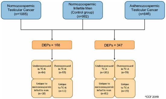 - Légaré, C.; Droit, A.; Fournier, F.; Bourassa, S.; Force, A.; Cloutier, F.; Tremblay, R.; Sullivan, R. Investigation of Male Infertility Using Quantitative Comparative Proteomics. J. Proteome Res. 2014, 13, 5403–5414. [Google Scholar] [CrossRef] [PubMed]