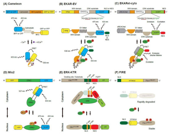 Schematic of single-molecule Förster (or fluorescence) resonance energy transfer (FRET) biosensors. (A) The construction and operating principle of Cameleon, a calcium biosensor. The calmodulin domain binds to M13 peptide domain in the presence of Ca2+, which causes a conformational change of the biosensor and increases the FRET efficiency between the donor FP (BFP or CFP) and the acceptor FP (GFP or YFP). (B,C) Similar principles are applicable in EKAR-EV (B) and EKARet-cyto (C). When phosphorylated, the threonine in the ERK substrate binds to the WW domain, which induces a conformational change of the biosensor and increases the FRET efficiency between the donor and acceptor FPs. The increased FRET efficiency can be detected as high FRET ratio (FRET/CFP) in ratiometric analysis (B) or shortening of the donor fluorescence lifetime in FLIM analysis (C). (D) In the Miu2 biosensor, the conformational change of ERK2 protein by active (phosphorylated) MEK results in the nuclear translocation of the biosensor and a decrease in FRET efficiency. (E) In the ERK-KTR biosensor, direct binding of active (phosphorylated) ERK and phosphorylation of the P-site mask the regulated NLS, which in turn causes the cytoplasmic translocation of the biosensor. (F) In the FIRE biosensor, phosphorylation of ERK substrate (Fra-1163-271) by active ERK stabilizes the construct and protects it from rapid degradation, thus resulting in high ERK activity and strong fluorescence signals.