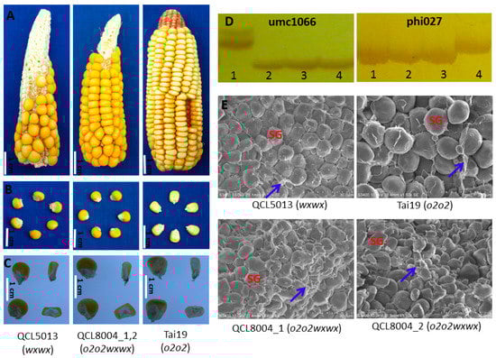 Phenotypic features of o2o2wxwx and recurrent parent. (A) Photographs of intact ears taken under normal light. (B) Photographs of mature kernels taken under normal light. (C) Light transmission of mature kernels on a light box, Bars = 1 cm. (D) Electrophoresis pattern of SSR marker for target gene o2 and wx. Lane 1, QCL5013; Lane 2, QCL8004_1; Lane 3, QCL8004_2; Lane 4, Tai19. (E) Scanning electron micrograph for endosperms of QCL8004_1, QCL8004_2, QCL5013, and Tai19 at 1500× magnification, respectively, Bars = 30 µm. SG, starch granules; Blue arrows, matrix protein.