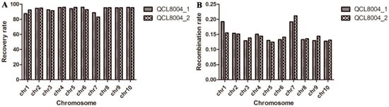 The background recovery rate (A) and recombination rate (B) of QCL8004_1 and QCL8004_2 in ten chromosomes.