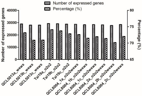 Quantitative expression analysis of the sequenced genes was presented as fragments per kilobase million (FPKM; Table S6). Overall, 28307, 28451, 28128, and 29061 genes were detected in QCL5013, QCL8004_1, QCL8004_2, and Tai19, respectively, accounting for 71.67%, 72.03%, 71.21%, and 73.58% of the total genes of corn (Figure 3), indicating that most genes were covered.