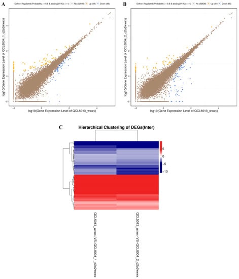 (A) Scatter plots of all expressed genes in each pairwise (QCL5013 vs. QCL8004_1). (B) Scatter plots of all expressed genes in each pairwise (QCL5013 vs. QCL8004_2). (C) Intersection heatmap of DEGs for each cluster plan.