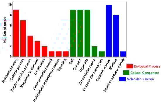 Gene ontology (GO) functional classification was performed for 49 significantly different genes; the results shown in Figure 5 and Table S7 were related to cell components (CC), molecular function (MF), and biological processes (BP). In CC, 10 genes were detected, which were involved in cells (GO: 0005623), cell parts (GO: 0044464), and organelles (GO: 0043226); in MF, 14 genes detected were involved in binding (GO: 0005488) and catalytic activity (GO: 0003824); in BP, 15 genes detected were involved in cellular processes (GO: 0009987) and metabolic processes (GO: 0008152), including nine genes involved in metabolic processes. Significantly different genes were mainly annotated into MF and BP, indicating that the o2 gene introgression into waxy corn primarily caused expression changes in genes related to catalytic activity and metabolic processes.