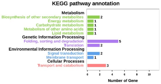 Pathway analysis of DEGs based on the Kyoto Encyclopedia of Genes and Genomes (KEGG) database showed that only 18 genes were annotated into 14 known KEGG pathways, while 31 DEGs were not annotated into any known KEGG pathways. As shown in Figure 6 and Table S8, six genes were annotated into metabolism, six genes into genetic information processing, three genes into environmental information processing, and three genes into cellular processes. In taurine and hypotaurine metabolism (KEGG 00430), Zm00001d033489.1, which encodes the key enzyme in the conversion of cysteine into hypotaurine (cysteine oxidase), was down-regulated in the endosperm of o2o2wxwx double mutants, thereby inhibiting hypotaurine synthesis. In starch and sucrose metabolism (K00500), Zm00001d033556.1 (K13648), which encodes the key element of pectin synthesis (galacturonosyltransferase), was up-regulated, thereby promoting pectin synthesis. In the phenylpropene (K00940) and flavonoid (K00941) metabolic pathways, Zm00001d037073.1 (hct3, hydroxycinnamoyl transferase3) and Zm00001d045145.1, which encode the down-stream enzymes of phenylalanine and tyrosine metabolism (hydroxycinnamoyl transferase and 2-oxoglutarate-dependent dioxygenase, respectively), were down-regulated, thereby inhibiting the degradation of phenylalanine and tyrosine.