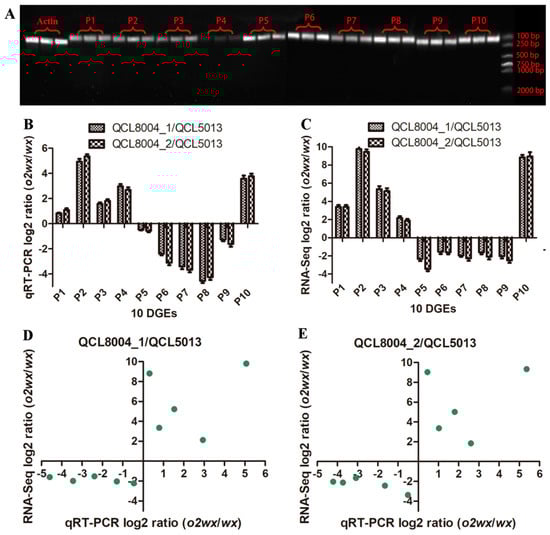 To validate the expression differences between o2wx and wx observed by RNA-Seq, we conducted quantitative real-time polymerase chain reaction (qRT-PCR) verification for 10 DGEs. Figure 7A shows that the designed primers for 10 DEGs showed better specificity. Meanwhile, the results shown in Figure 7B demonstrated that the qRT-PCR expression patterns of these 10 genes were similar to those measured by transcriptional sequencing (Figure 7C) between QCL8004_1 vs. QCL5013 and QCL8004_2 vs. QCL5013. In addition, Pearson coefficients of QCL8004_1 vs. QCL5013 and QCL8004_2 vs. QCL5013 were 0.8760 and 0.8843, respectively (Figure 7D,E). The RNA-seq results showed high relevance to the qRT-PCR results, indicating data reliability.