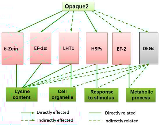 Moreover, the O2 not only directly activates genes associated with a variety of nutrient storage genes and enzymes involved in carbon and amino acid metabolism pathways, but also controls transcription factors that regulate various other aspects of plant metabolism []. EF-1α and LHT1 levels in corn endosperm highly correlate with lysine content, and show increased transcription [,], while 10 kDa zein shows decreased transcription []. Our results demonstrated that the O2 gene regulated multiple metabolic pathways related to BP and MP during waxy maize endosperm development. In the o2o2wxwx kernels, Zm00001d029385.1 and Zm00001d012262.1, which encode the EF-1α and LHT1, respectively, were up-regulated, while Zm00001d011063.1, which encodes sulfur-rich proteins (mostly 10 kDa zein), was down-regulated. These changes can improve the grain lysine content of waxy maize, although the functions of these genes in lysine biosynthesis or transport need to be further studied. Meanwhile, the O2 can directly or indirectly activate HSPs and EF2, and other DEGs associated with response to stimulus, the metabolic process, and other aspects of plant metabolism (Figure 8). These results are important for elucidating the underlying molecular mechanisms in the lysine content improvement of waxy corn following the o2 gene introgression. The above genes that reduce zeins and increase the lysine content may be used for gene editing or the development of new biomarkers to promote molecular quality breeding.