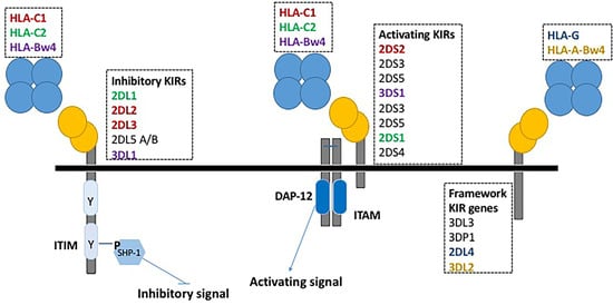 KIRs, expressed on the membrane of NK cells and a minority of T lymphocytes, regulate the killing function of these cells by interacting with specific amino acid motifs, public epitopes, carried by some HLA class I molecules, and expressed on their targets. They are characterized by two or three extracellular domains and a short (S) or long (L) intracytoplasmic tail that respectively transduces either activating or inhibitory signals (see Figure 1). The KIR gene complex is characterized by multiple gene-content haplotypes, i.e., it is polygenic. KIR genes are organized in two basic haplotypes defined on the basis of gene content, and are termed A and B. Group A haplotypes are characterized by the absence of the following genes KIR2DL5, KIR2DS1, KIR2DS2, KIR2DS3, KIR2DS5 and KIR3DS1, whereas group B haplotypes are characterized by the presence of one or more of the previous genes. Thus, the B haplotypes have more genes encoding activating KIR than A haplotypes. Moreover, KIR genes exhibit allelic variability, i.e., they are polymorphic. Furthermore, KIR expression on NK cells is stochastic, resulting in a significant variation of the NK cell repertoire among individuals and among populations. KIRs are able to detect cells infected by viruses or transformed, by binding the different class I allelic variants. Most inhibitory KIRs specifically recognize sets of HLA class I alleles; yet, the ligands for some of them and for most activating KIRs are unknown. Specific combinations of KIRs with their cognate HLA ligands have been associated with infectious diseases, autoimmune disorders, pregnancy outcomes and cancer. In addition, they are crucial in determining clinical outcomes of both hematopoietic stem cell and solid organs transplantation [,,,].