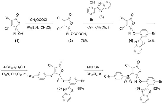 3,4-Dichloro-5-hydroxy-2(5H)-furanone (mucochloric acid, 1) (Vekton, Moscow, Russia) was recrystallized from water, mp 127 °C. 4-Methylthiophenol (Alfa Aesar, Ward Hill, MA, USA), 3-chloroperoxybenzoic acid (Acros Organics), and CsF (TCI) were used as received without further purification. All organic solvents were purified and distilled using standard procedures. 3,4-Dichloro-5-methoxycarbonyloxy-2(5H)-furanone (2) [24] and 2-(benzothiazol-2-yl)-4-bromophenol (3) [23] were synthesized according to the previously reported methods. NMR and HRMS spectra are given in the Supplementary Material (Figures S1–S4).