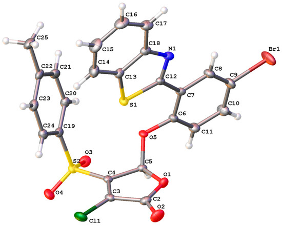 In addition, the molecular and crystal structure of furanone 6 was characterized using single crystal X-ray diffraction (Figure 2). According to the X-ray data, compound 6 is represented by the chloroform solvate in the examined crystal in the main compound/solvent ratio = 2:1. The chloroform molecule in the crystal is in the special position in the center of symmetry. The overall conformation of the molecule 6 can be described as cisoid—aromatic substituents are situated on one side of the plane of the heterocyclic fragment.