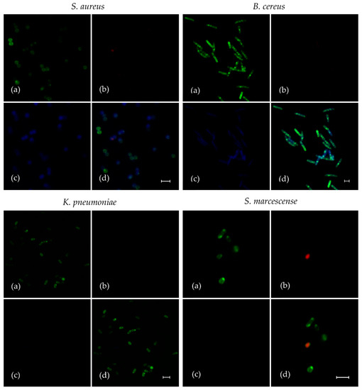 The substitution of l-menthol by fluorescent moiety drastically reduced the antibacterial activity of F145. Its MICs for all Gram-positive bacteria became 128 mg/L and higher, confirming the strong requirement of l-menthol pharmacophore for activity, as was shown earlier [18,21]. Nevertheless, the planktonic bacteria were treated with F145 for 30 min and its penetration into the cells was assessed with CLSM (Figure 3). Cells were presumed as viable (Figure 3a) due to the fact that only single occurrences of red-stained (dead) cells were observed (Figure 3b). In accordance with antibiotic susceptibility test results (Table 1), the blue fluorescence of F145 was observed only in S. aureus and B. cereus. Moreover, as long as DioC6 dye stains bacterial cell membrane and accumulates in the cell edge, F145 fluorescence is distributed evenly in the cells (Figure 3c), which strongly suggests that F145 penetrates into the cell and accumulates there. Notably, as can be observed in spatial overlap between three fluorescent labels (Figure 3d), F145 was detected in both alive and dead S. aureus and B. cereus cells. These data clearly indicate that F145 easily permeates the cell membrane S. aureus and B. cereus, but S. marcescens and K. pneumonia seem to remain impermeable for the furanone.