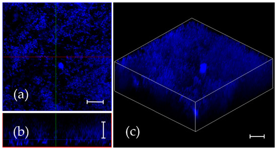 F145 diffusion into the mature S. aureus biofilm. The 24 h old biofilm was treated with F145 for 1 h and analyzed with confocal laser scanning microscopy using a single-channel mode. (a) X; Y orientation of the biofilm; (b) Z-stack of the biofilm; (c) 3D-model of the biofilm. The scale bars indicate 10 μm.