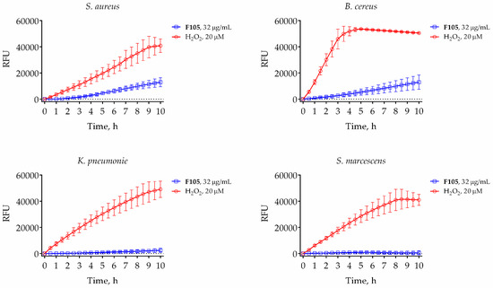 Dynamics of reactive oxygen species (ROS) production in bacteria induced by 20 μM of hydrogen peroxide (red line) or 32 μg/mL of F105 (blue line). Black line stands for untreated control cells. Bacterial cells were grown for 18 h, harvested, and washed with PBS. Cells were re-suspended until the final density of 105 CFU/mL in PBS supplemented with 2′,7′-dichlorofluorescin diacetate (DCFDA) (5 μM). After 30 min of pre-incubation at 25 °C, 32 μg/mL F105 or 20 μM H2O2 were added and the fluorescence was measured for 9 h with 5-min time intervals.