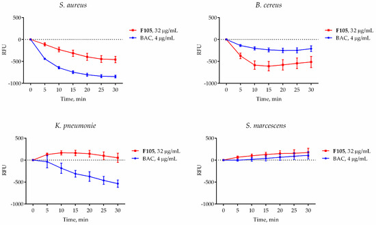 The effect of F105 (blue line) and benzalkonium chloride (red line) on the membrane potential of bacterial cells. Bacteria were grown for 18 h, harvested, and washed with PBS. Cells were re-suspended until the final density of 105 CFU/mL in PBS supplemented with DioC2 (10 μM). After 30 min preincubation at 25 °C, F105 or BAC were added until final concentrations of 4 or 32 μg/mL, respectively (corresponding to their respective MBCs), and the fluorescence was measured for 30 min with 5-min intervals. Black dashed line indicates the same data for the untreated control cells.