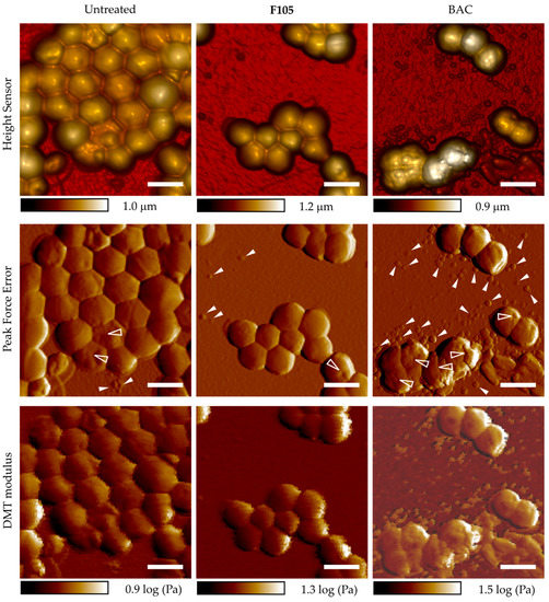 Atomic force microscopy (peak force tapping mode) images of S. aureus planktonic cells after 18 h incubation with 4 μg/mL of BAC or 32 μg/mL of F105 (in correspondence with their respective MBCs). Scale bar is 2 µm. Cell wall damage is shown with transparent arrows; cell debris particles and organic substances are shown with white arrows).