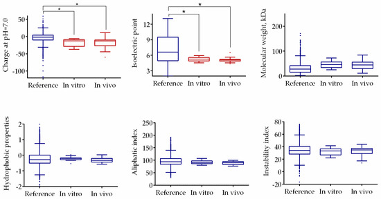Comparison of physical and chemical properties of the putative substrates for the interaction with F105 with translated S. aureus proteome. Asterisks denote statistically significant differences of medians (* p < 0.05).