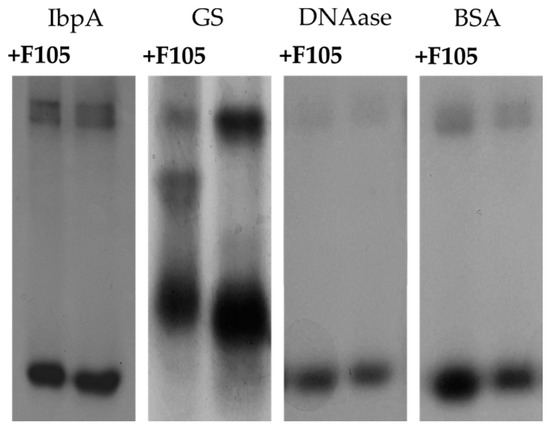 To check the assumption that F105 could interact with proteins, a number of proteins with a pI lower than 7 and negative charge were treated with F105 and separated with native PAGE in comparison with non-treated samples (Figure 9). Significant changes in migration of F105-treated small heat-shock protein IbpA from Acholeplasma laidlawii (calculated relative mobility change index 0.971 ± 0.015) and glutamine synthetase from Bacillus subtilis (calculated relative mobility change index 0.979 ± 0.004) were detected (Table 3). A slight shift in mobility was observed for DNAase and BSA. These data are in agreement with previous observation that F105 interacts with proteins and apparently damages their structural or physical-chemical properties leading to the consequent cell death.