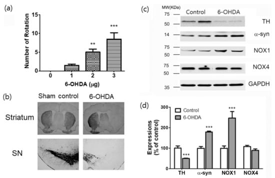 2.1. Motor Deficit, Loss of TH+ Cells, Increased Expression of α-Synuclein and NOX1 in the 6-OHDA-Lesion Side of the Striatum and Substantia Nigra