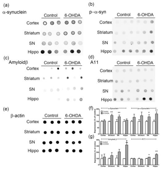 2.3. Levels of Alpha-Synuclein and Amyloid Beta Pathology in Animals with MFB Injury Caused by 6-OHDA Injection
