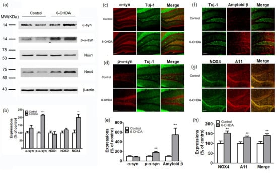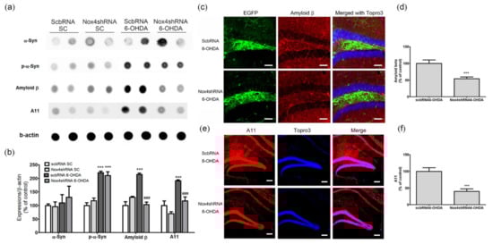 2.6. NOX4 Knockdown Reduces 6-OHDA-Mediated Amyloid Beta and A11 Oligomer Upregulation in the Hippocampus