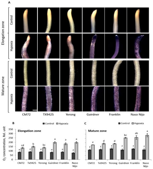 (A) Histochemical detection of superoxide (O2•−) in the elongation and mature zone in the roots of six barley cultivars differing in waterlogging tolerance. (B) Relative quantification of the O2•− concentration in the elongation and (C) the mature root of barley. Image J software (NIH, Bethesda, MD, USA) was used to calculate relative (O2•−) concentration by targeting the fluorescence integrated density. Data are the mean ± SE; n = 150–250; 20–30 cells analysed for at least 6–8 individual seedlings (biological replicates). The scale bar = 1 mm. Different lowercase letters indicate the significant difference at p ≤ 0.05 according to Duncan’s multiple range tests.