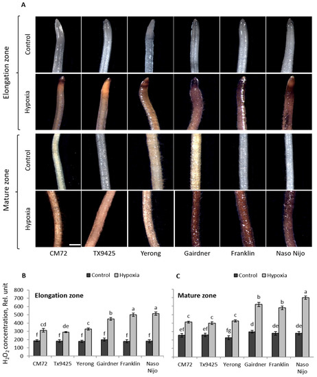 The 48 h of hypoxia stress affected the accumulation of O2•− radical in all cultivars, but to different extents. A higher accumulation of O2•− in both elongation and the mature zones was observed in waterlogging sensitive cultivars Gairdner, Franklin, and Naso Nijo (Figure 1A). These visual observations were then quantified by Image J software, revealing statistically significant (p < 0.05) differences between sensitive and tolerant cultivars (Figure 1B,C). The production of O2•− in both elongation and mature zones was almost 1.5- to 2-fold higher in waterlogging sensitive cultivars than in tolerant cultivars. For H2O2, the intensity of the brown color was greater in sensitive cultivars after hypoxia, suggesting more H2O2 production compared with appropriate controls (Figure 2A). Similarly, sensitive cultivars showed 2- to 2.5-fold higher accumulation of H2O2 compared with tolerant cultivars in both elongation and mature zones (Figure 2B,C) when analysed with Image J software.