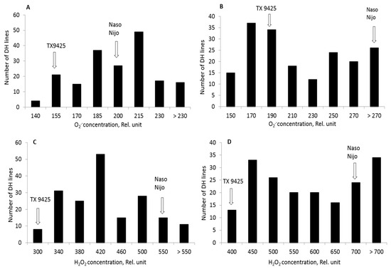(A,B) The frequency distribution for superoxide (O2•−) and (C,D) hydrogen peroxide under hypoxia (0.2% agar) stress of DH lines derived from a cross between TX9425 and Naso Nijo.