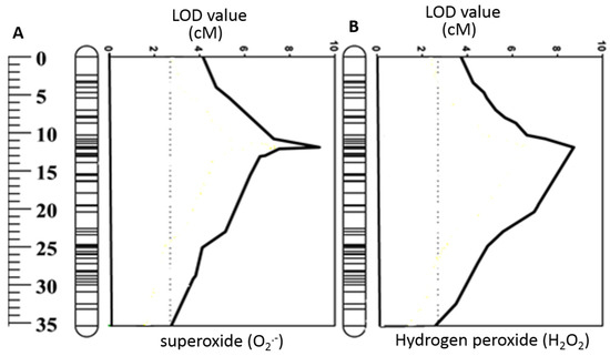 (A) QTL associated with superoxide (O2•−) radical, and (B) hydrogen peroxide (H2O2). For the clarity, only parts of chromosome regions are shown.