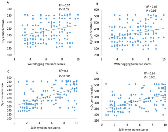 Correlations between (A) superoxide (O2•−) radical concentration in mature zone and waterlogging tolerance scores, (B) hydrogen peroxide (H2O2) concentration in elongation zone and waterlogging tolerance scores, (C) superoxide (O2•−) radical concentration in mature zone and salinity tolerance scores, and (D) hydrogen peroxide (H2O2) concentration in elongation zone and salinity tolerance scores.