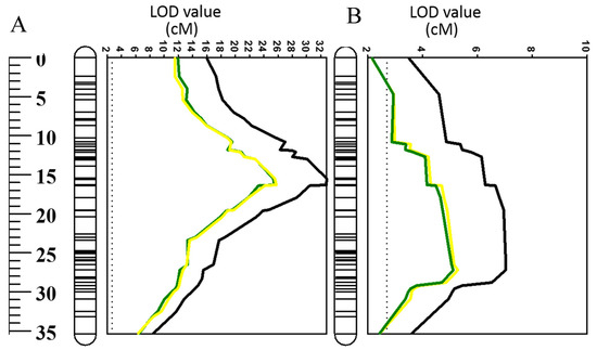 QTL associated with (A) salinity and (B) waterlogging tolerance (LOD values) on 2HS. Black line: LOD value of original QTL; green line: LOD value of QTL when superoxide (O2•−) in the mature zone was used as a covariate; yellow line: LOD value of QTL when hydrogen peroxide (H2O2) in elongation zone was used as a covariate.