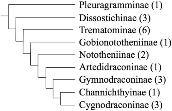 - Lautrédou, A.-C.; Hinsinger, D.D.; Gallut, C.; Cheng, C.-H.C.; Berkani, M.; Ozouf-Costaz, C.; Cruaud, C.; Lecointre, G.; Dettai, A. Phylogenetic footprints of an Antarctic radiation: The Trematominae (Notothenioidei, Teleostei). Mol. Phylogenet. Evol. 2012, 65, 87–101. [Google Scholar] [CrossRef]