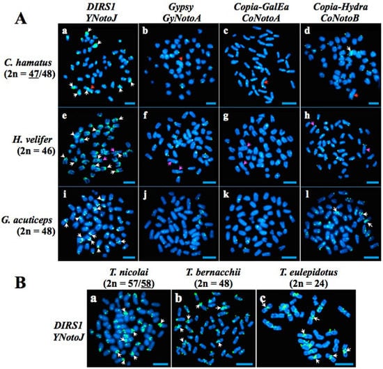 - Auvinet, J.; Graça, P.; Belkadi, L.; Petit, L.; Bonnivard, E.; Dettaï, A.; Detrich, W.H.; Ozouf-Costaz, C.; Higuet, D. Mobilization of retrotransposons as a cause of chromosomal diversification and rapid speciation: The case for the Antarctic teleost genus Trematomus. BMC Genomics 2018, 19, 339. [Google Scholar] [CrossRef]