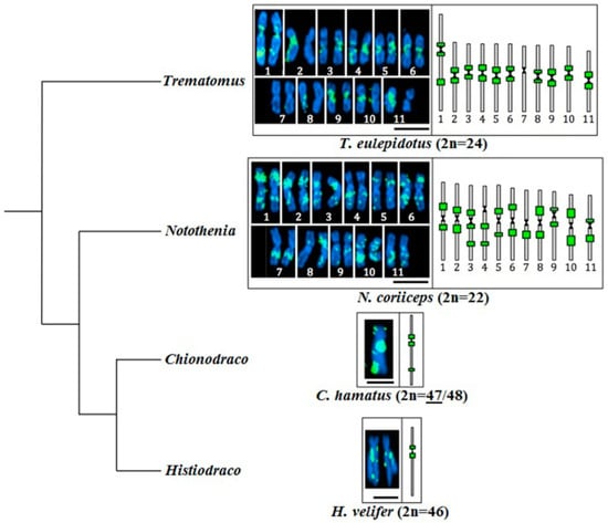 - Ghigliotti, L.; Cheng, C.C.-H.; Ozouf-Costaz, C.; Vacchi, M.; Pisano, E. Cytogenetic diversity of notothenioid fish from the Ross sea: Historical overview and updates. Hydrobiologia 2015, 761, 373–396. [Google Scholar] [CrossRef]