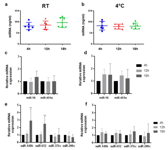 Stability of cell-free microRNAs (cf-miRNAs) stored in EDTA monovettes. Content of cf-miRNA (ng/mL) in plasma after storing blood for 4, 12, and 18 h at room temperature (RT) (a) and 4 °C (b) in six healthy subjects. Bar plots showing enrichment of miR-16 and miR-451a after 12 and 18 h, relative to 4 h, stored at RT (c) and 4 °C (d). qRT-PCR results showing the differences in miR-148b, miR-652, miR-376c, and miR-200c after 12 and 18 h stored at RT (e) and 4 °C (f), relative to 4 h. Stars represent level of significance with (**) for p-value < 0.01.