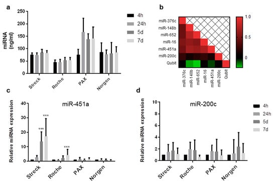 Stability of cf-miRNAs stored in long-term storage tubes. Content of cf-miRNA in plasma after storing blood from eight healthy subjects for 4 h, 24 h, 5 days, and 7 days at RT in Streck, Roche, PAX, and Norgen tubes (a). Heat map representing the correlation in expression among the miRNAs tested. (b) qRT-PCR results showing the differences over time in miR-451a (c) and miR-200c (d) in samples stored in different tubes. Relative cf-miRNA expression compared to the 4-h time point is shown on the x-axis. Stars represent level of significance with (***) for p-value < 0.001.