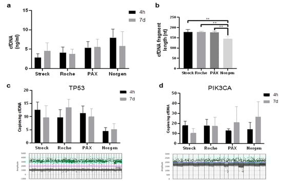 Next, we aimed to analyze cfDNA stability in plasma from five of the eight subjects above, as future studies may want to combine cf-miRNA and cfDNA markers for disease diagnosis. We focused on the 4-h and 7-day timepoints, as all vendors claimed to stabilize cfDNA for at least 7 days. DNA content remained stable in all conditions (Figure 3a), with the most cfDNA extracted from samples stored in Norgen tubes (Supplemental Figure S6), closely followed by PAX tubes. The least amount was extracted from Streck and Roche tubes (Supplemental Figure S6). In addition to cfDNA quantification, the size of cfDNA was analyzed. All tubes yielded cfDNA with similar peak sizes ranging from 168 to 180 bp, except Norgen tubes, with a significantly lower peak size at around 150 bp at both investigated time points. (Figure 3b and Supplemental Figure S7). Finally, we utilized droplet digital PCR (ddPCR) to measure the amounts of two cancer relevant genes, TP53 and PIK3CA (Figure 3c,d). For TP53, the least amount of counts were found in samples stored in Norgen tubes (Figure 3c). For PIK3CA, similar copies were obtained from all four tube types (Figure 3d).